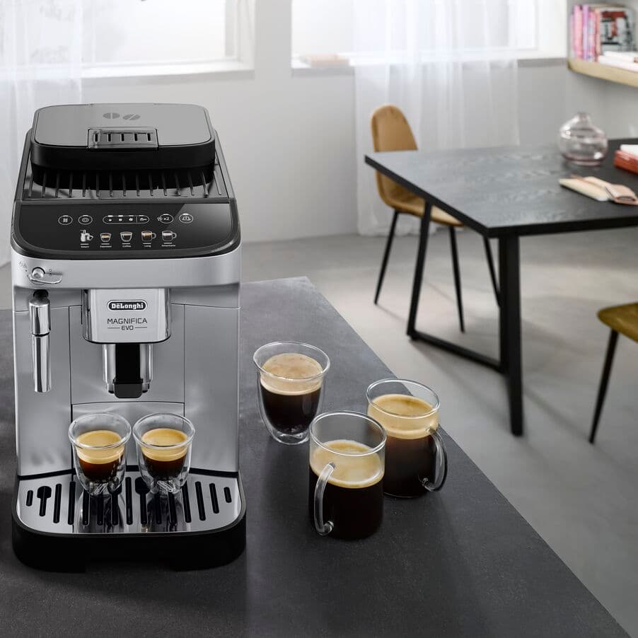Genießen Sie dank der De’Longhi Magnifica Evo das ultimative Kaffeeerlebnis bequem von zu Hause aus. Bereiten Sie den perfekten Espresso aus frisch gemahlenen Bohnen zu. Ausgestattet mit einem intuitiven Soft-Touch-Display mit farbigen Symbolen für jedes Rezept. Die stilvolle schwarz-silberne Optik ist die perfekte Ergänzung für jede moderne Küche.