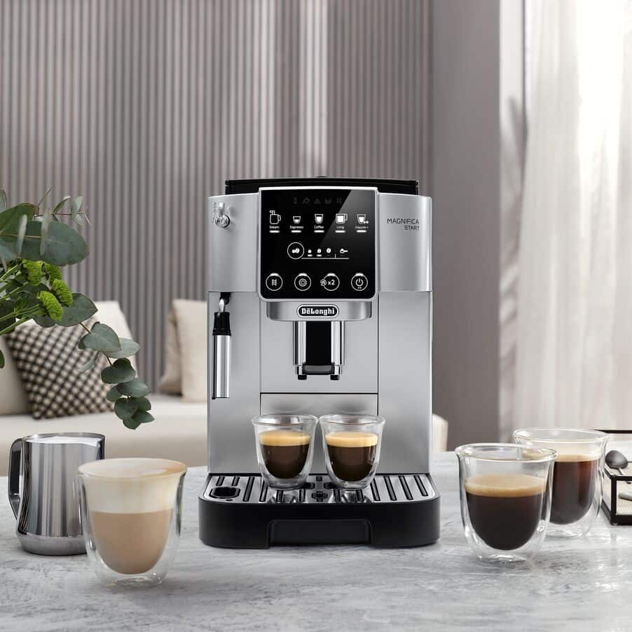 Tauchen Sie ein in die Welt des Kaffees - von der Bohne in die Tasse. Mit der Magnifica Start von De'Longhi, die Ihnen alles bietet, was Sie für die Zubereitung Ihres espressobasierten Lieblingskaffeegetränks zu Hause benötigen. Sie verfügt über eine nutzerfreundliche Bedienoberfläche und ein schwarz-graues Finish. Über die individuelle Getränkeauswahl können Sie Ihr Getränk mit nur einem Knopfdruck zubereiten lassen.